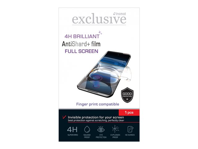 The Insmat Exclusive AntiShard+ screen protector is designed to enhance the longevity and clarity of cellular phone screens. Constructed from a durable film material with a 4H hardness rating, this protector resists scratches and provides reliable protection against explosions. It includes smudge-proof and anti-glare features, ensuring that screens stay clean and clear for better visibility in various lighting conditions. With eye protection technology, the AntiShard+ enhances viewing comfort while safeguarding your device from daily wear and tear. Each package includes essential accessories for a hassle-free installation, such as a spatula, wet cloth, and dry cloth. This full-screen protector ensures comprehensive coverage, making it an ideal choice for those looking to maintain their phone's integrity while enjoying a pristine display.