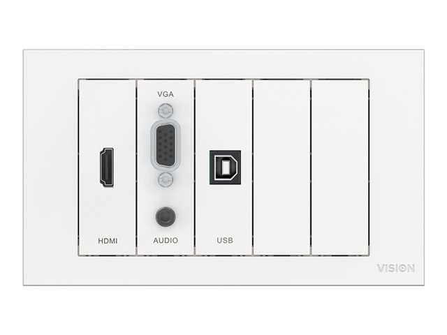 A "surround" which comes in two parts fits to a backbox (or "mudring" if your wall is hollow), then the modules fix in place to complete the installation. Techconnect is based around standard UK backbox sizes, and Vision also offers mounting hardware for other countries.