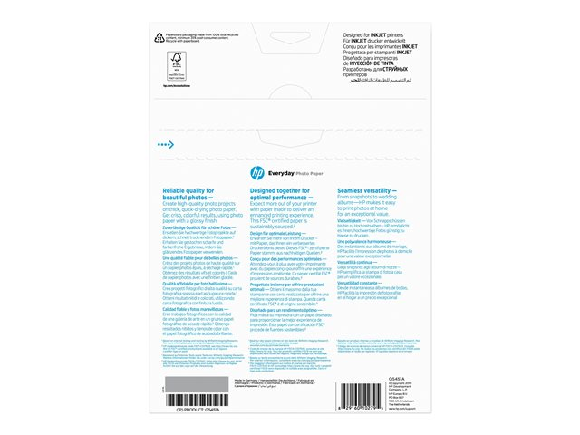 HP Everyday-fotopapir gir fargerike fotoprosjekter til en lav pris. Dette resirkulerbare, glansede papiret tørker raskt og kan brukes på hvilken som helst blekkskriver. Bruk HP Photo Creations-programvaren til å lage kalendere, fotokuber og annet.