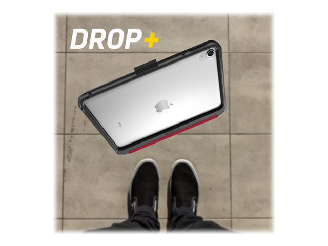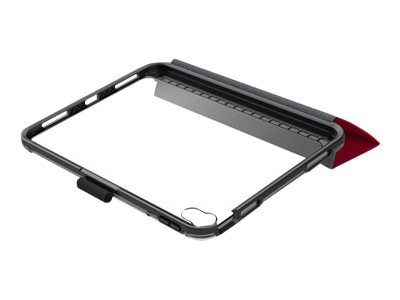 Symmetry Series Folio clear folio case protects your tablet against drops, and its clear back makes it easy to identify engravings and asset tags. The microfiber folio lining guards the screen an elastic band holds it closed. The folio quickly converts into two positions for typing and viewing. Plus, the case stays put on slick surfaces thanks to no-skid rubber feet.