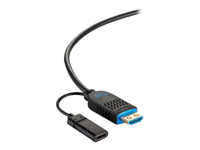 HDMI AOCs have been engineered with quality components to give a robust design and enhanced performance, ideal for installation needs that are beyond the length limitations of standard HDMI copper cabling. Adding a thicker wire gauge and Kevlar, the cables have been improved with pull strength and overall structural integrity. The shielding in these cables optimizes the EMC, preventing unwanted electromagnetic interference and electrostatic discharges, contributing to the long-term reliability of the connected system. The cable jacket meets the fire code requirements for installation within plenum spaces, like a dropped ceiling. The AOC draws power from the HDMI source device. If additional power is needed, an integrated USB-C power pigtail is included on the display end to offer an external power option to maximize compatibility.