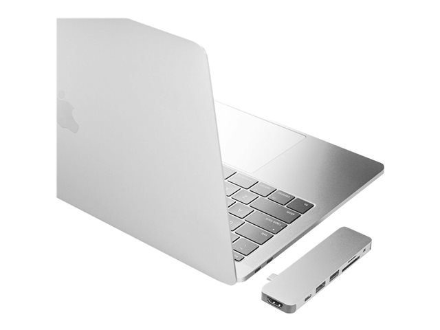 Form-fitting USB-C Hub for MacBook Pro and Air. This USB-C docking station attaches to MacBook adding 8 ports: 4K HDMI output, USB-C power delivery, and more.