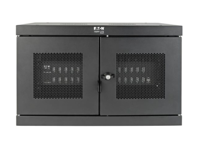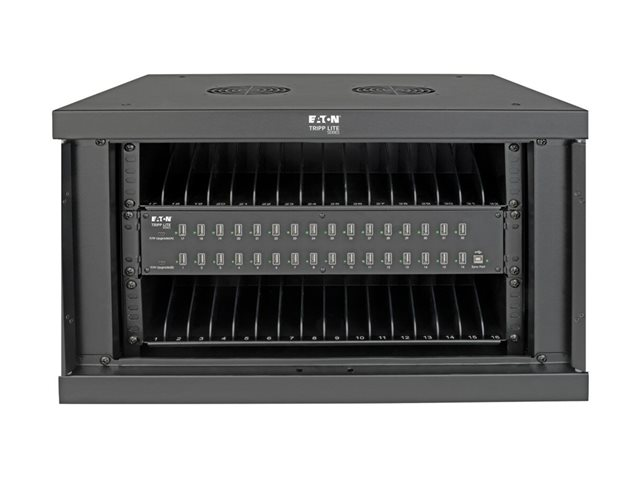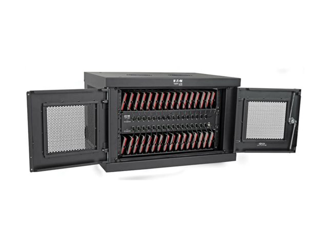 Eaton Tripp Lite Series 32-Device USB Charging Station Cabinet er en omfattende ladeløsning som er utformet for å dekke behovene i miljøer som skoler, kontorer og butikker. Med kapasitet til å lade opptil 32 enheter samtidig gjennom USB-A-portene, sørger dette skapsystemet for effektiv energidistribusjon og enhetsadministrasjon. Den allsidige designen gjør det mulig med både stasjonære og veggmonterte oppsett, noe som gir fleksibilitet i plassering i henhold til tilgjengelig plass og brukerens preferanser. Sikkerheten er prioritert med en nøkkellås og en låsbar frontdør som beskytter enhetene under lading. Skapet er konstruert av slitesterkt stål med en elegant svart pulverlakkert overflate, og er ikke bare robust, men passer også sømløst inn i ethvert profesjonelt miljø. Tilleggsfunksjoner som EMI- og RFI-filtrering, hurtigladefunksjoner og et omfattende monteringssett gjør det til et viktig verktøy for sikker og effektiv håndtering av flere enheter.